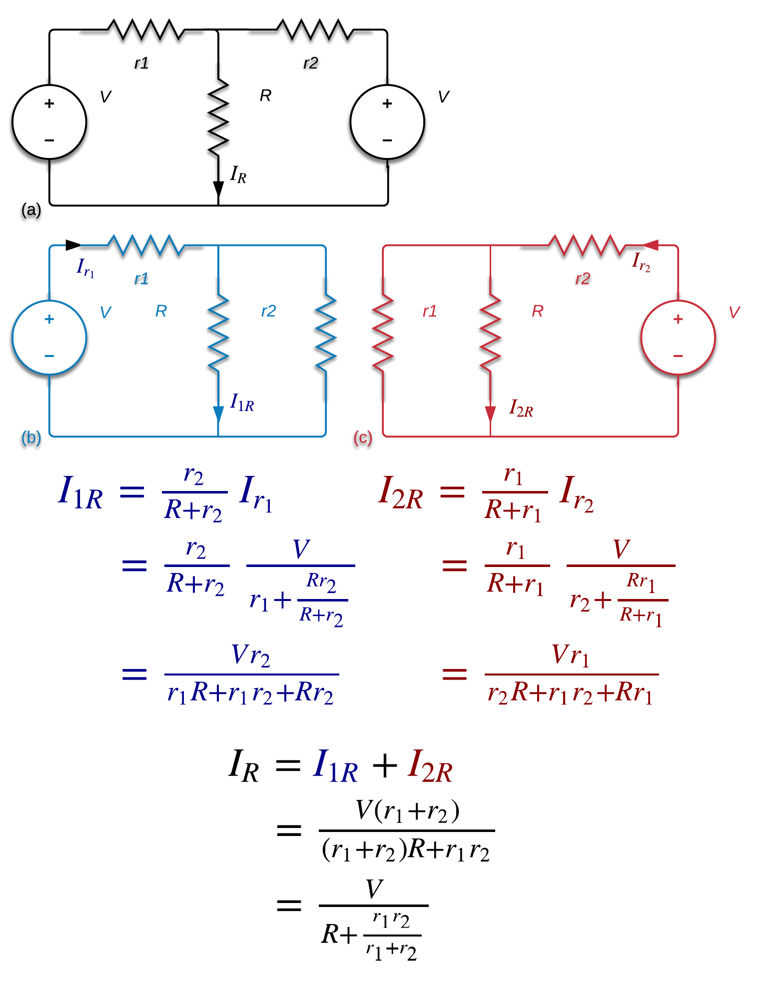 In any linear circuit with multiple independent sources, the voltage or current for any element in the circuit is the algebraic sum of the voltages or currents caused by each independent source acting alone, while all other independent sources are turned off (replaced by their internal impedances).