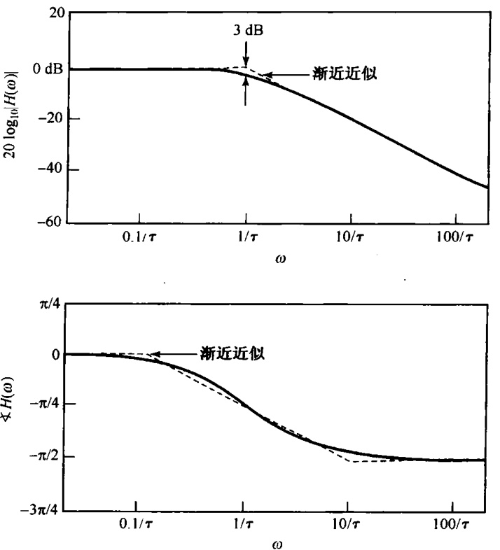 从极点向量随 变化的规律来看, 很明显其频率响应 的模随 增加而单调下降, 而 则单调地从0下降到 , 如该系统的伯德图所示. 同时也注意到, 当 时, 极点向量的实部和虚部相等, 从而频率响应的模从它在 时的最大值下降了 , 或近似下降3 dB;而此时频率响应的相位是 值. 这与6.5.1节讨论一阶系统时所得结论相一致, 在那里就将 称为3dB点或转折频率, 也就是I 1伯德图的直线近似在斜率上有一个转折处的频率. 时间常数控制了一阶系统的响应速度, 这样一个系统在 的极点在负实轴上, 它到原点的距离就是该时间常数的倒数.