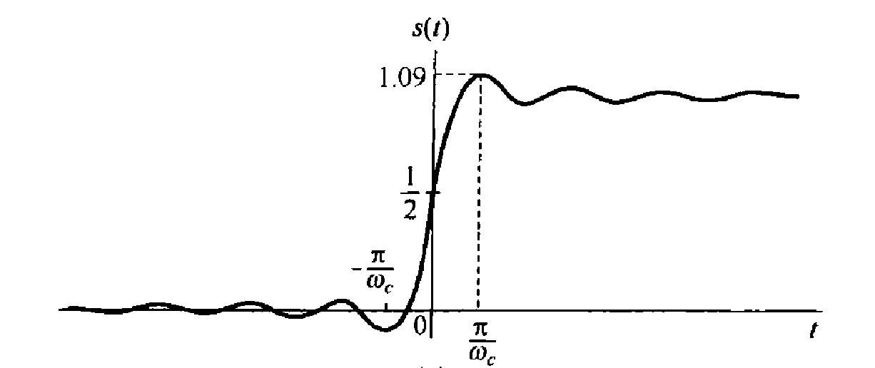 The unit step responses of the ideal low-pass filters are shown below. We can see that the step response exhibits several characteristics that we may not desire. In particular, for these filters, their step responses all have overshoots larger than their final steady-state values, and they exhibit oscillatory behavior known as ringing.