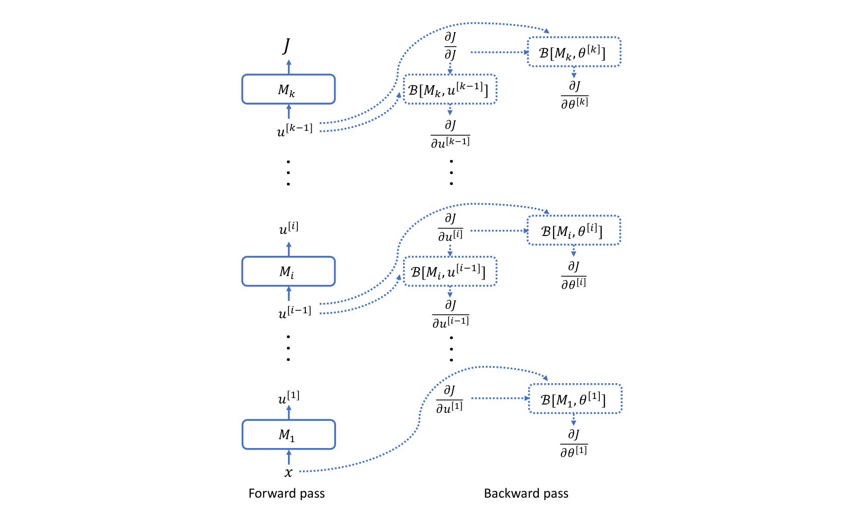 We take the viewpoint that neural networks are complex compositions of small building blocks such as MM, , Conv2D, LN etc., then we can abstractly write the loss function (on a single example ) as a composition of many modules