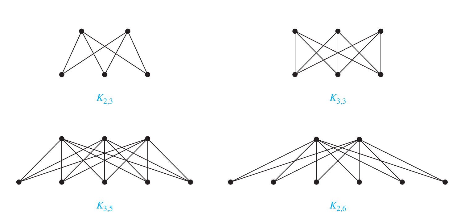 A complete bipartite graph is a graph that has its vertex set partitioned into two subsets of and vertices, respectively with an edge between two vertices if and only if one vertex is in the first subset ant the other vertex is the second subset.