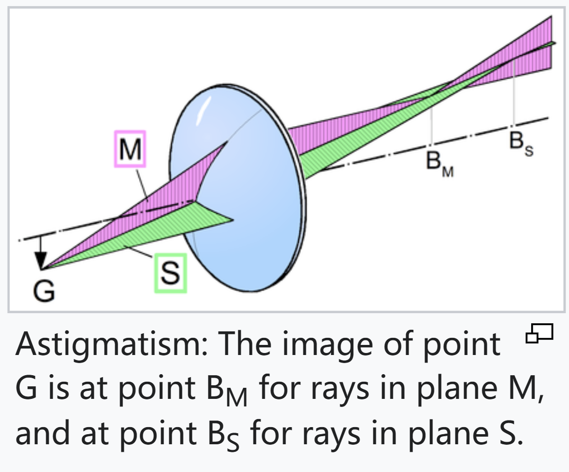具有像散的光学系统是指在两个垂直平面中传播的光线具有不同焦点的光学系统. 如果使用具有像散的光学系统来形成十字图像, 则垂直线和水平线将在两个不同距离处清晰聚焦.