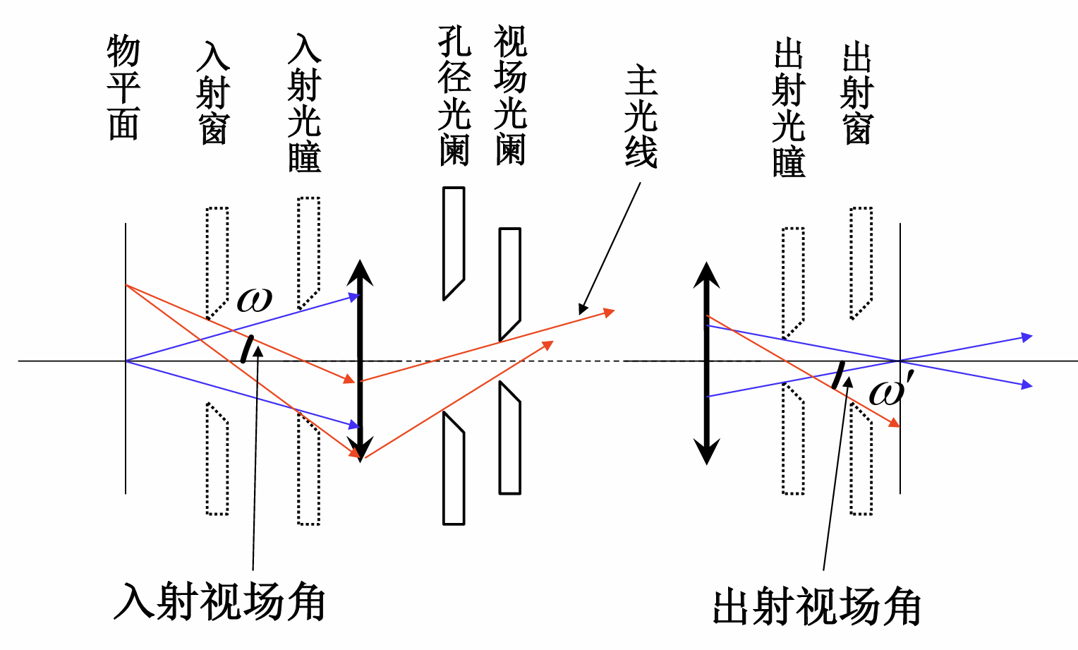 决定轴外物点的主光线能否通过光具组的光阑. 恰好能通过光具组主光线与光轴在物方和像方的夹角叫做入射视场角和出射视场角