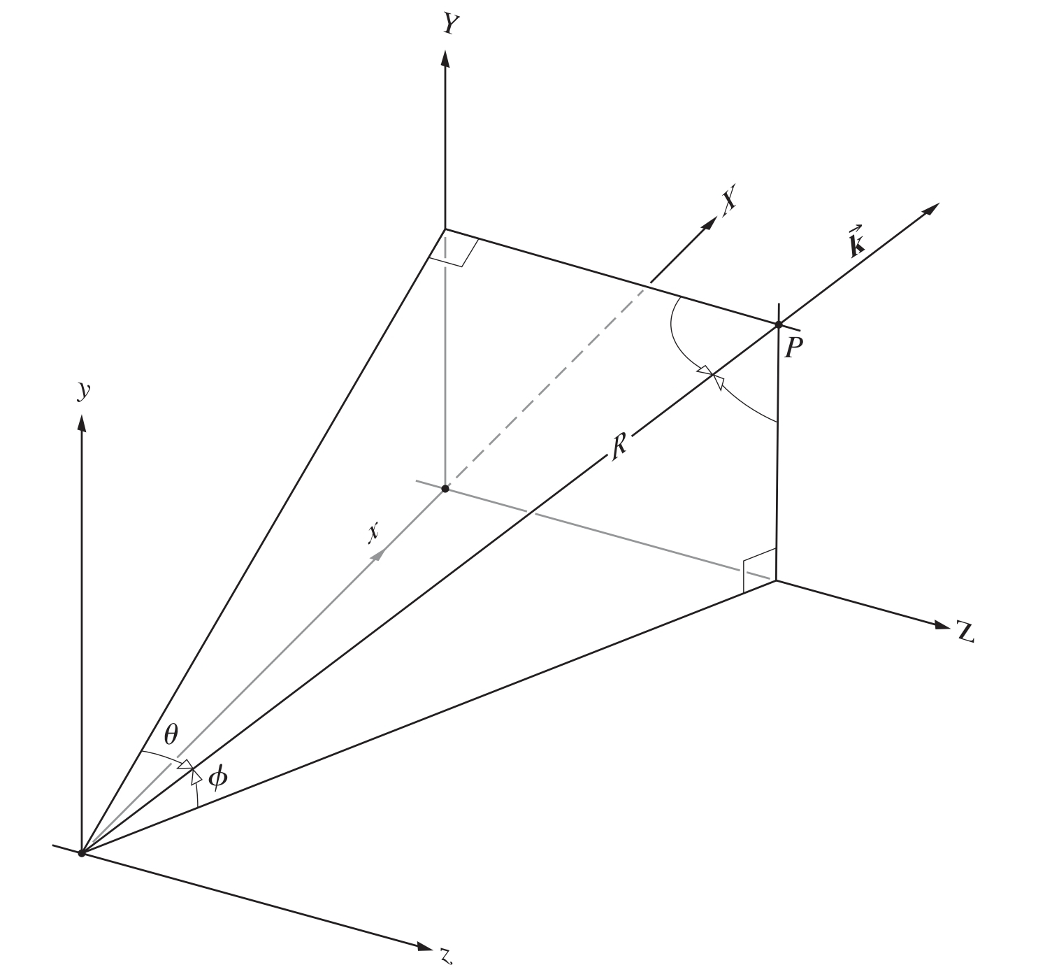 分析衍射屏上每一个面元在光屏上某点贡献的振幅, 可以看做是由一列沿着方向(即方向)传播的振幅为平面波贡献的(在远场条件下, 光屏接收到的光波才能被视为平面波;又因为光屏足够远, 尺度也远大于像小孔这样的衍射屏, 所以只要接受的位置确定, 衍射屏上的每一个面元产生的平面波都可以看作拥有一样的)