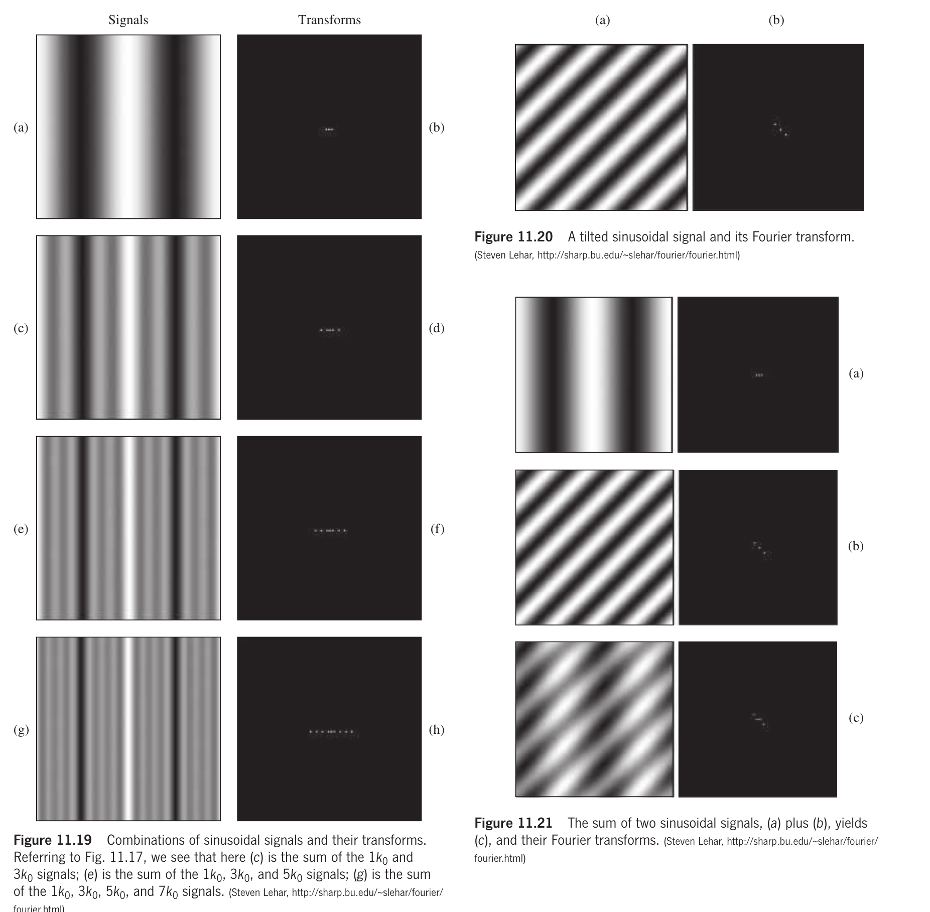 若把上面图中的倾斜信号与图中的最低频率信号相加, 生成图左侧的模式. 这个组合信号的Fourier变换是构成该信号的各个变换的和, 即三个水平脉冲点叠加在三个倾斜脉冲点上. 这展示了如何通过添加许多不同方向、涵盖广泛空间频率的余弦项来生成更复杂的图像.