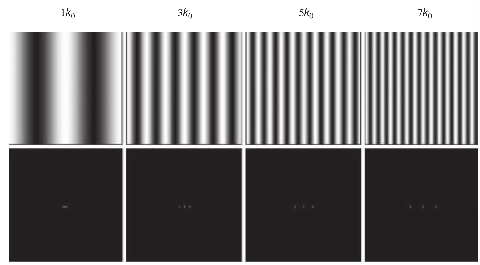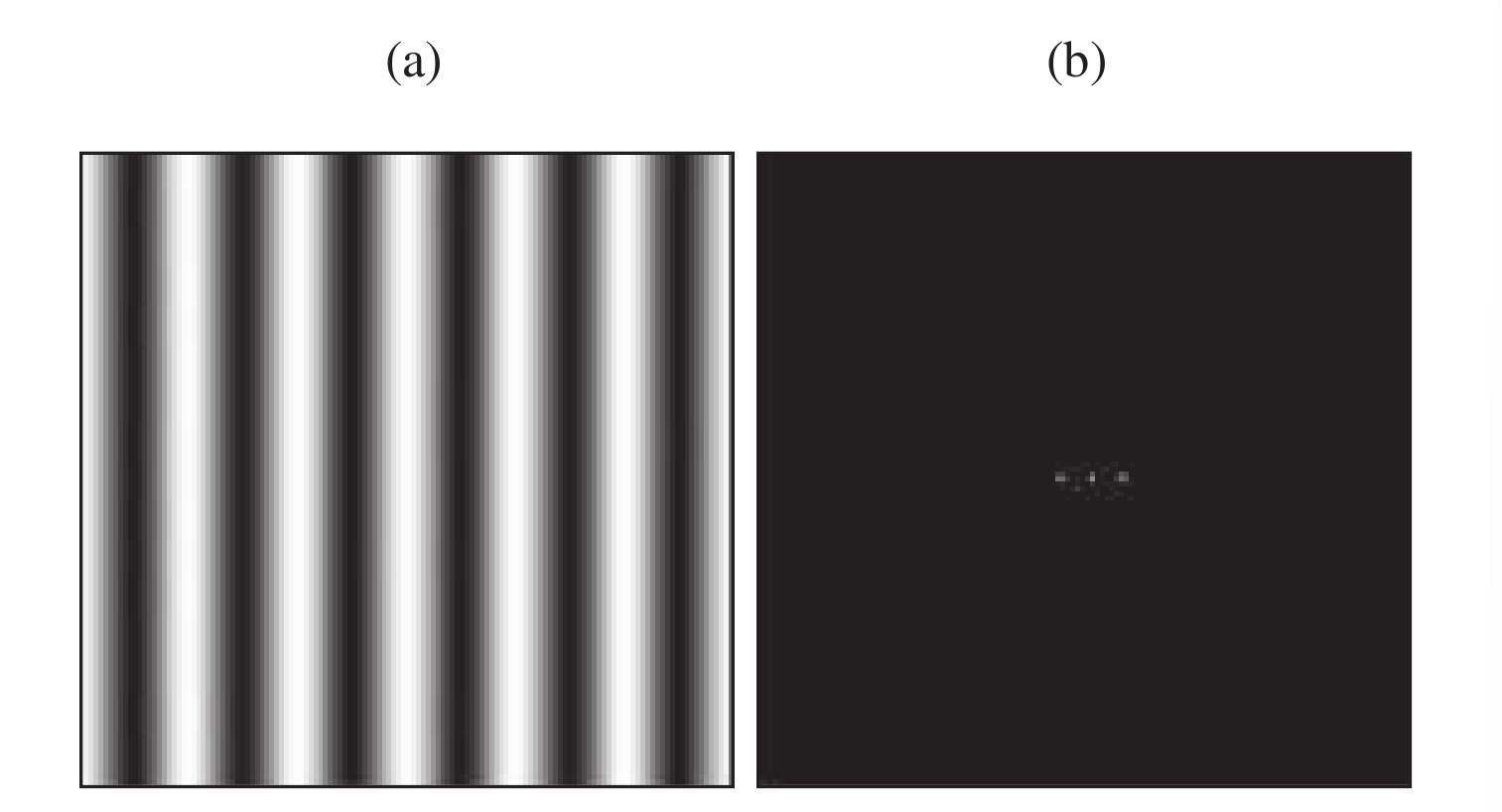 上面展示的二维Fourier变换, 其中每个点或像素代表一个特定的Fourier频率分量. 中心的点代表直流项, 在物理图像系统中总是存在这样的分量. 它被两个点所包围, 这两个点代表了余弦波的频率信息. 像素的亮度代表了特定空间频率傅里叶分量的幅度.