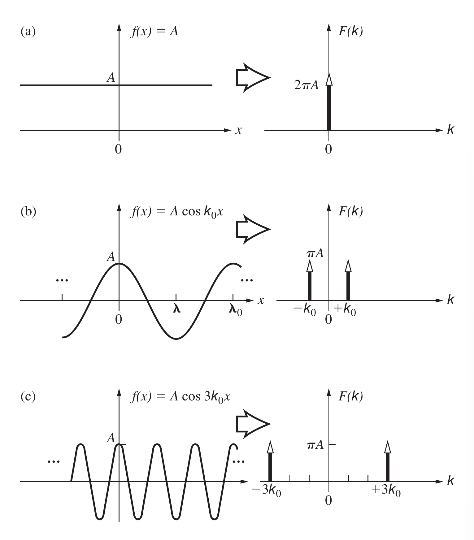 如果我们把余弦信号旋转一个任意角度, 信号的空间波长和幅度保持不变. 这个倾斜信号的Fourier变换(假设信号是无限的)与之前相同, 仍然是三个脉冲函数. 这些脉冲函数位于与信号带垂直的直线上, 并且与信号一样旋转了相同的角度. 在上述所有情况下, 如果我们对每个Fourier变换取逆变换, 我们就能重建原始的空间信号.