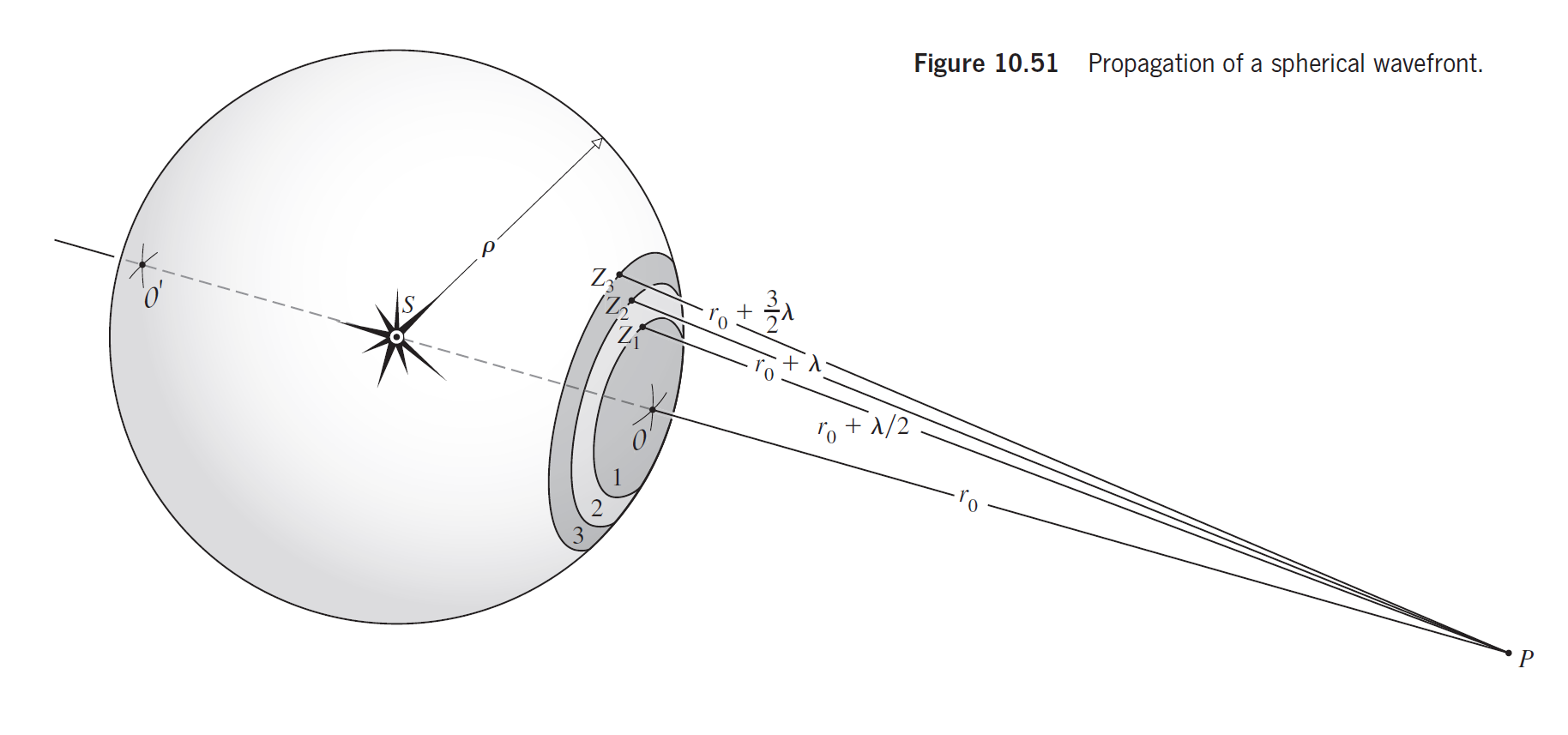 把波面分割成一个个的半波带, 相邻半波带到像点的距离逐个相差半个波长. 相邻半波带贡献的复振幅的相位差为,相互抵消. 在自由传播时, 整个波前在像点产生的振幅是第一个半波带的效果之半, 即