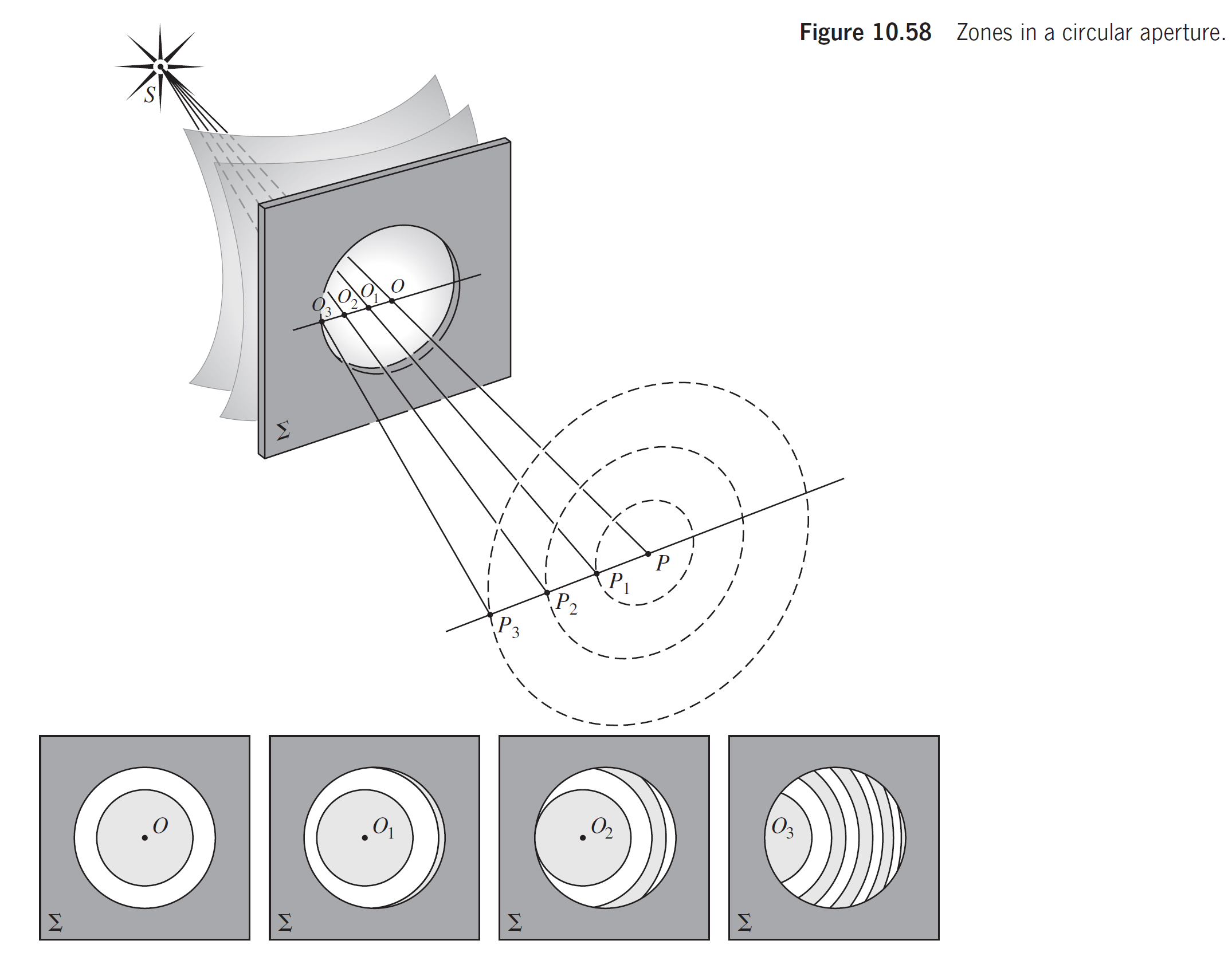 孔径的区域内的半波带数量取决于点到点的距离. 当点沿着中心轴的任一方向移动时, 半波带的数量无论增加还是减少都在奇数和偶数之间振荡. 因此, 光强将经历一系列最大值和最小值, 形成的衍射条纹