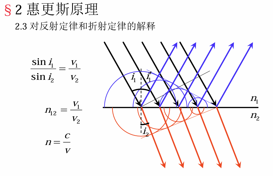 - 反射、折射定律: 在两种介质的界面发生反射和折射 反射光、折射光满足