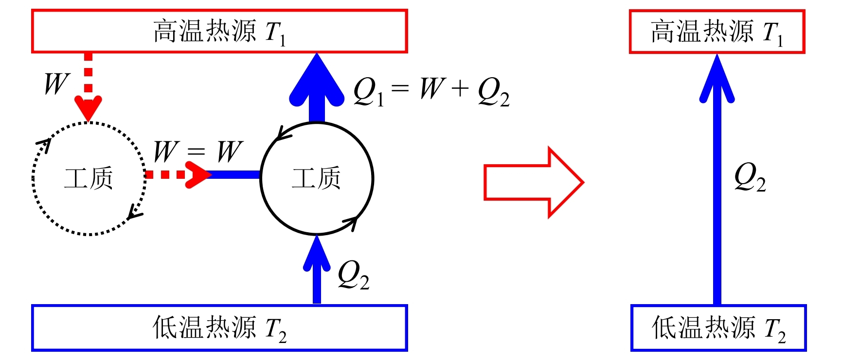 - 若Clausius表述不正确, 则Kelvin表述也不正确: 可以把某一热机向低温热源放的热全部释放到高温热源, 那么就相当于实现了一个只需要一个热源的热机