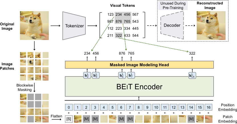 - The aim is to predict the visual tokens of the original image that the decoder could use to reconstruct the image (though the decoder is not used in this pre-training period)