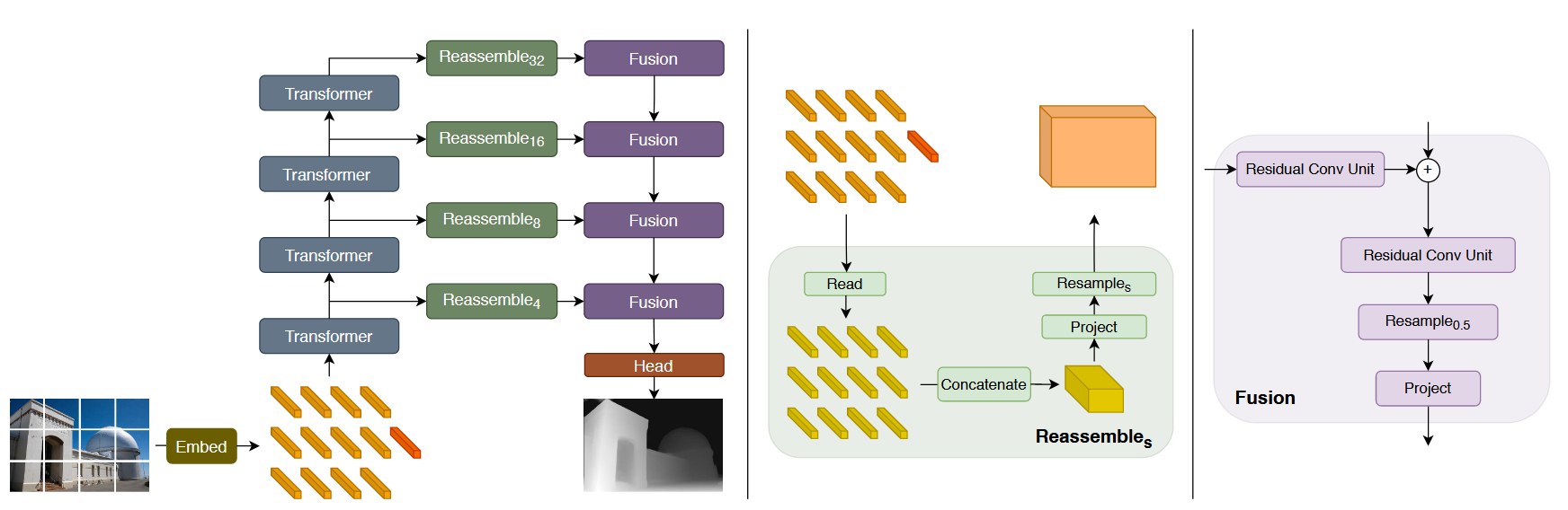Assemble token from various stages of the vision transformer into image-like representations at various resolutions and progressively combine them into full-resolution predictions using a convolutional decoder