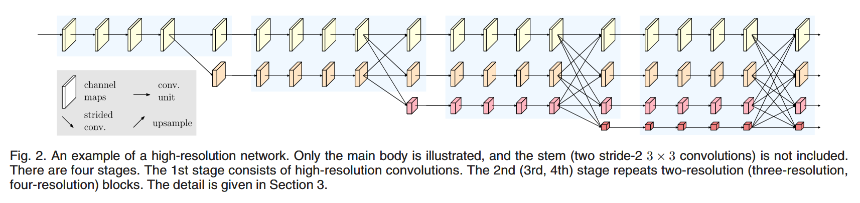 - Start form a high-resolution convolution steam, gradually add high-to-low resolution convolution streams one by one, and add connect the multi-resolution streams in parallel. The resulting network consists of several stages, and the -th stage contains streams corresponding to resolutions