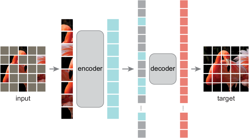 - A large random subset of image patches is masked out, and the visible patches are taken as the input of the encoder