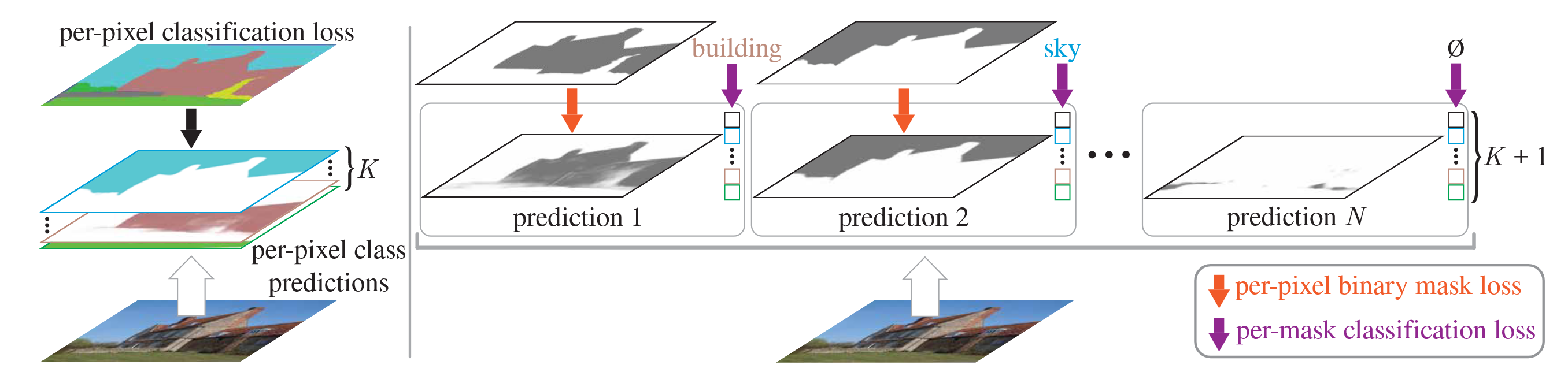 Each prediction is supervised with a per-pixel binary mask loss and a classification loss