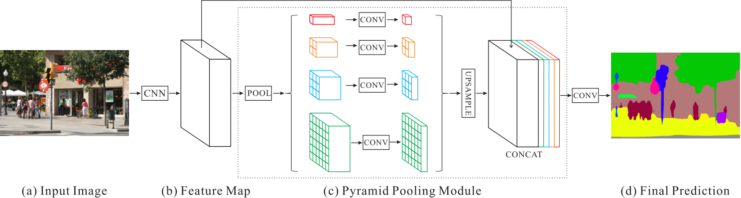 The output of different levels in the pyramid pooling module contains the feature map with varied sizes. To maintain the weight of global feature, we use convolution layer after each pyramid level to reduce the dimension of context representation to of the original one if the level size of pyramid is . Then we directly upsample the low-dimension feature maps to get the same size feature as the original feature map via bilinear interpolation. Finally, different levels of features are concatenated as the final pyramid pooling global feature.