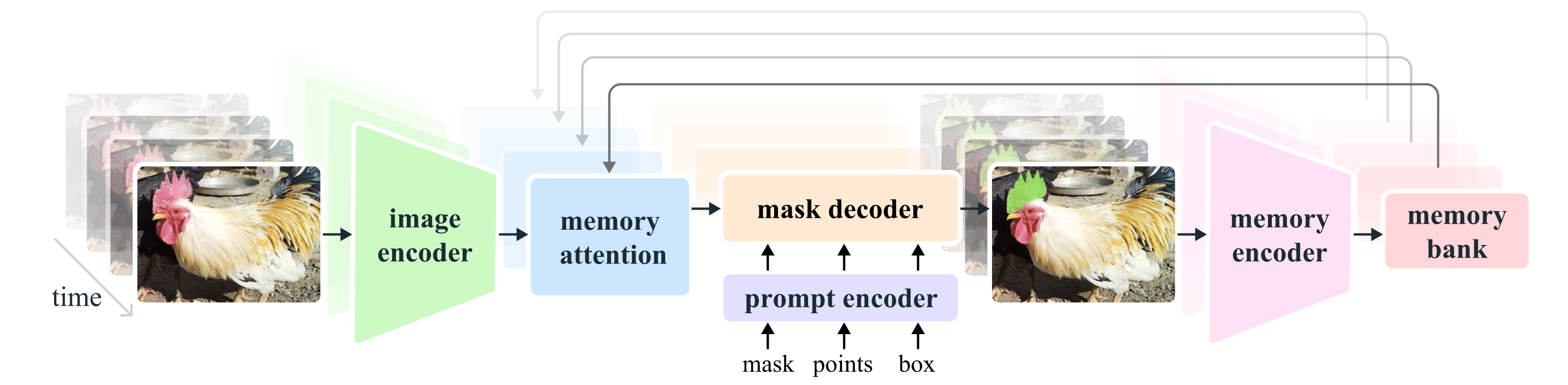 For a given frame, the segmentation prediction is conditioned on the current prompt and/or on previously observed memories. Videos are processed in a streaming fashion with frames being consumed one at a time by the image encoder, and cross-attend to memories of the target object from previous frames. The mask decoder, which optionally also takes input prompts, predicts the segmentation mask for that frame. Finally, a memory encoder transforms the prediction and image encoder embeddings for use in future frames.