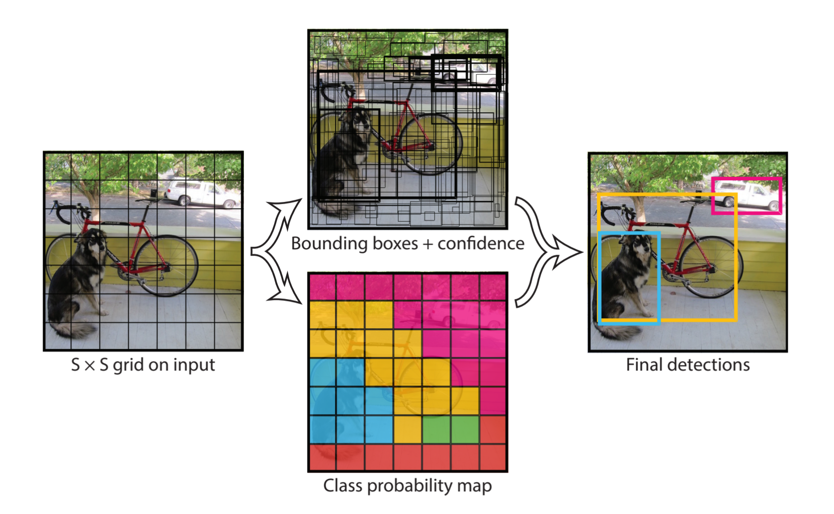 - After that, we have each grids having scores and box positions for every class. Then we could obtain the boxes for each class by combing all the gird box predictions together whose class scores for this certain class if relatively high.